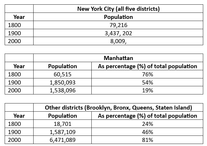 Task 1: The first table below shows changes in the total population of New York City from 1800 to 2000. The second and third tables show changes in the population of the five districts of the city (Manhattan, Brooklyn, Bronx, Queens, Staten Island) over the same period. Summarise the information by selecting and reporting the main features, and make comparisons where relevant.