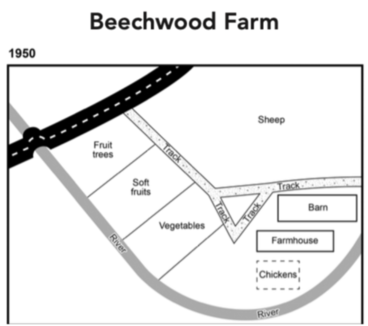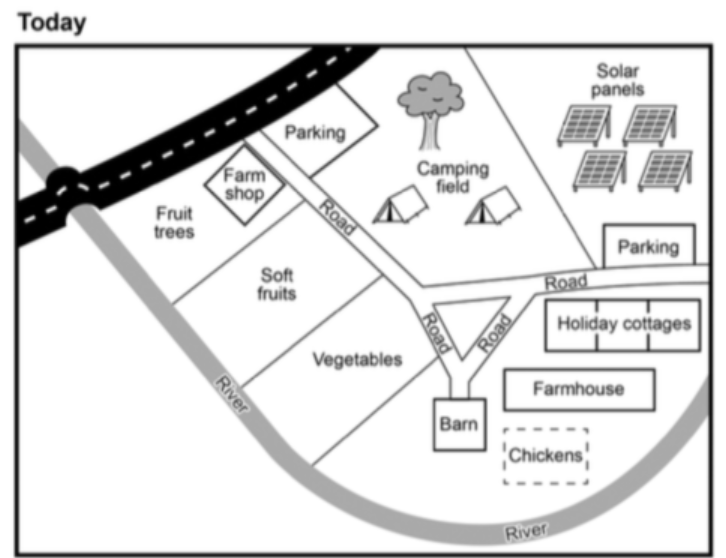 Task 1: The plans below show the site of a farm in 1950 and the same site today. Summarise the information by selecting and reporting the main features, and make comparisons where relevant.