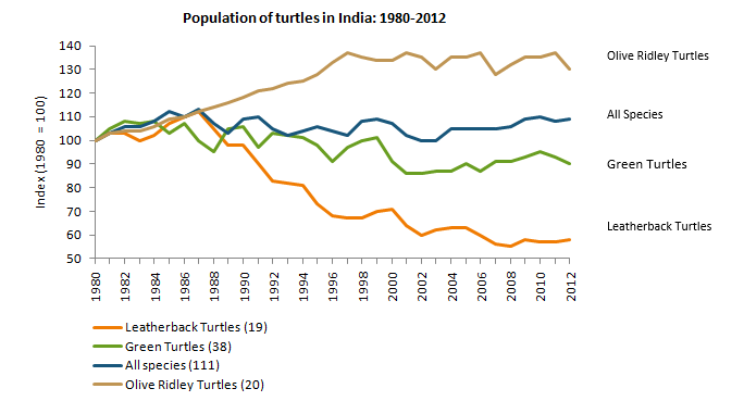 Task 1: The graph below shows the population figures of different types of turtles in India between 1980 and 2012.