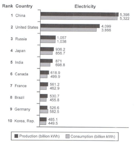 Task 1: The bar chart below shows the top ten countries for the production and consumption of electricity in 2014.