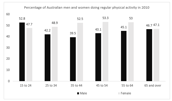 Task 1: The bar chart below shows the percentage of Australian men and women in different age groups who did regular physical activity in 2010.